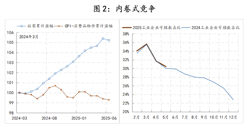 一是内卷式竞争加剧。自国务院于2024年3月印发《推动大规模设备更新和消费品以旧换新行动方案》,“以旧换新”政策已实施了15个月,大幅提振了消费,15个月间社会零售总额累计增长了5.2%。但受内卷式竞争影响,在消费端,消费量的增加没有带动物价上升,同期的消费品价格反而累计下跌了0.7%,出现了严重的“价格内卷”。在生产端,行业内利润进一步向个别企业集中,出现了严重的“链条内卷”。