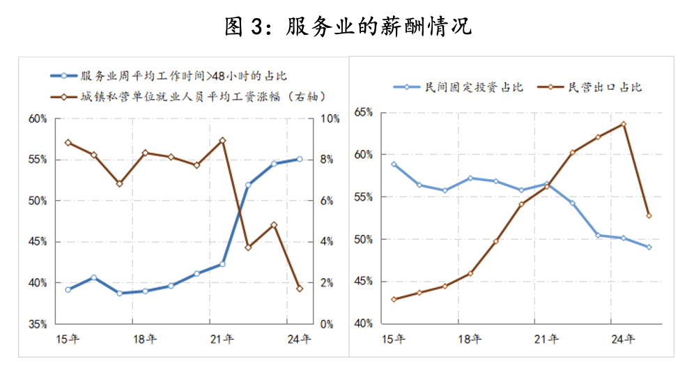 二是服务业缺口的扩大。近年来,服务业工作时长持续上升,截至2024年末,服务业周平均工作时间超过48小时的占比已升至55%,较之前占比提高了15个百分点,与此同时,平均工资涨幅则由8%降至2%以下,工作时长与工资涨幅的“一升一降”,意味着服务业的小时工资水平在持续下降。另外,自2021年开始,民营经济出口占比就持续高于其投资占比,意味着民营经济产能的扩张更多体现在出海方面,相应民营经济在本土的新增就业相对下降。就业和收入功能的下降,意味着服务业缺口在扩大。