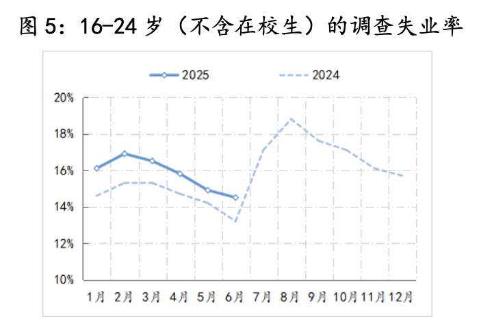 第四,青年人就业的不饱和。去年9月增量政策实施以来,青年人的就业状况得到大幅改善,去年9月至今的三个季度中,青年人失业率有7个月是下降的。不过,青年人尚未实现充分就业,例如,上半年各月的青年人失业率平均较去年同期水平还高出1个百分点。智联招聘发布的《2025 年二季度人才市场热点快报》显示,二季度我国服务业就业市场需求前两位分别是宠物服务(招聘职位数增速达72.2%)、养老/看护(招聘职位数同比增长42.1%),更加折射出青年人面临就业市场的现状。青年人就业的不饱和,不仅影响自身消费,还将改变代际福利总水平,如今啃老已不是局部现象了,进而影响全社会的消费情绪。“啃老”代表着非就业青年人的消费完全依靠长辈,类似于上世纪日本“失落期”,日本青年人群体中出现的“NEET 族”——Not in Education, Employment or Training。