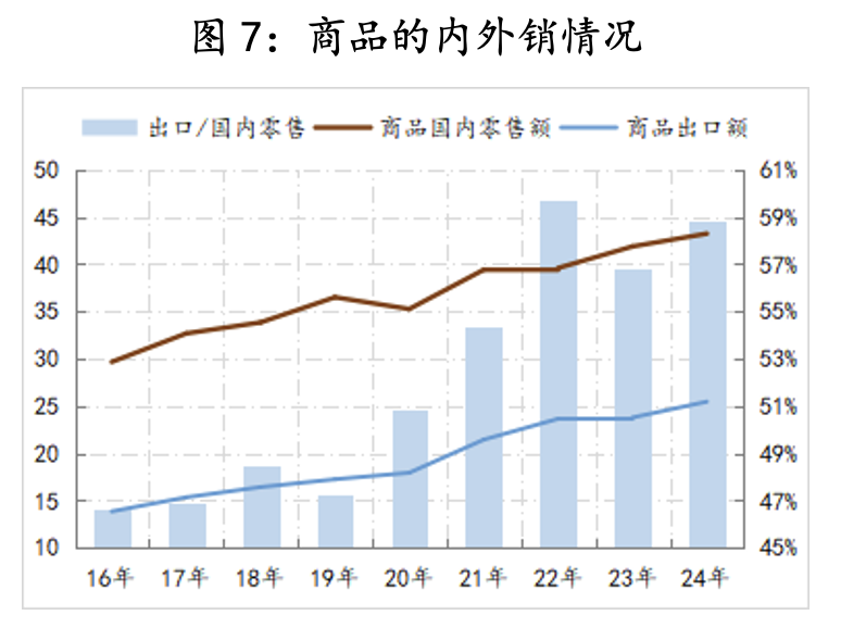 第五,产需矛盾更趋复杂。按照高盛公司的分析(《China in Transition: China's capacity - The delayed inflection》),2024年中国供应了全球86%的光伏组件、80%的锂电池、74%的空调、68%的新能源汽车、54%的钢铁、33%的工程机械和28%的功率半导体(IGBT),即便是在如此高的产能基础上,今年上半年的汽车、钢铁等行业产能利用还在上升,产需矛盾的平衡更趋复杂。